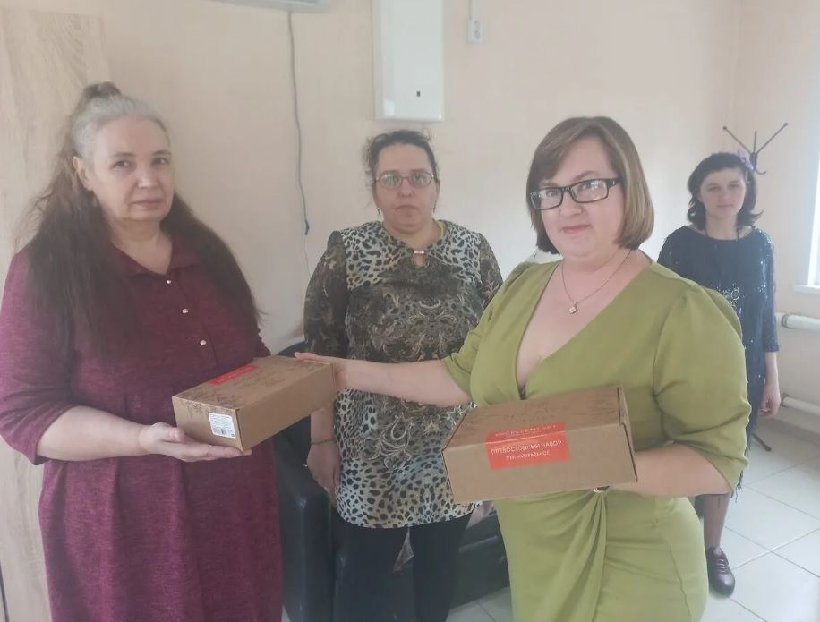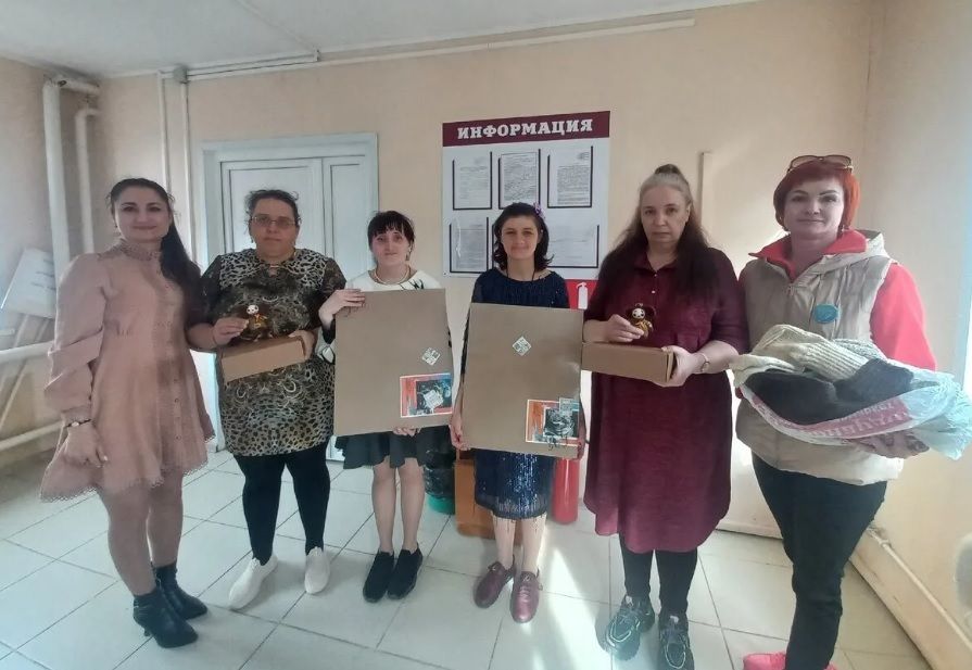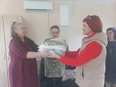 Светлана Владимировна присоединилась к поздравлениям, вручив женщинам именных Чебурашек. Эти милые игрушки, которых Светлана вяжет своими руками, уже стали любимцами военнослужащих и тружеников тыла. Чайные наборы и наборы для алмазной вышивки, очень порадовали проживающих дома-интерната. Женщины в свою очередь передали для бойцов очередную партию теплых носков.