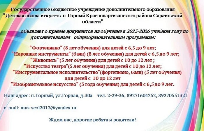 Детская школа искусств п. Горный объявляет набор на обучение в 2025-2026 учебном году!