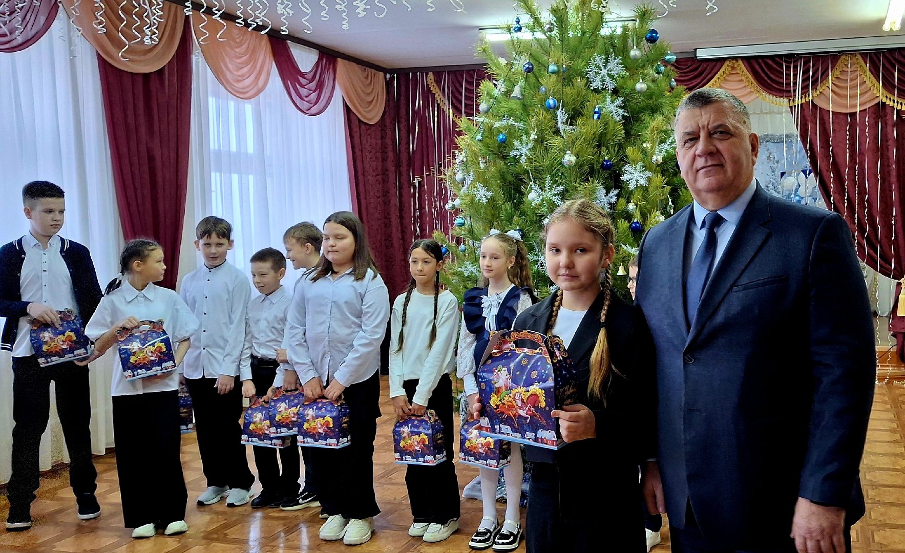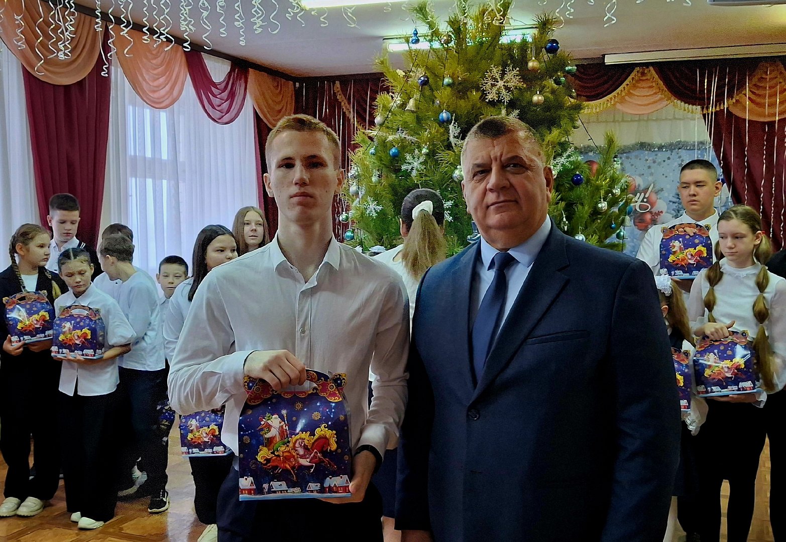 Глава МО п. Михайловский А.М. Романов поздравил ребят и их наставников с наступающим Новым годом и Рождеством Христовым, вручил сладкие подарки.