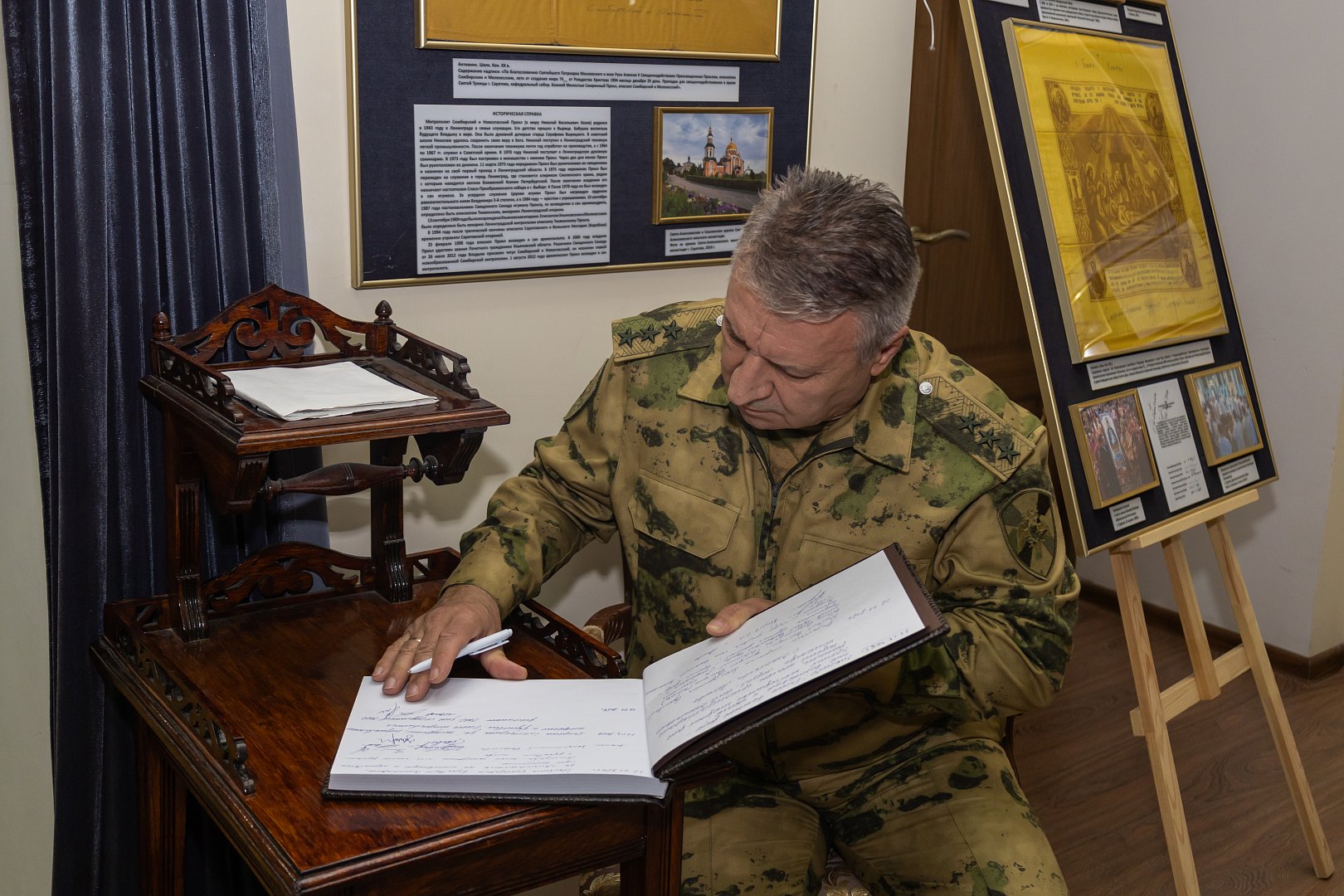 В ходе поездки командующий встретился с ректором Саратовской духовной семинарии протоиереем Сергеем Штурбабиным и ответственным за духовноеокормлениеросгвардейцев протоиереем Владимиром Кашириным. Священнослужители провели для командующего округом экскурсию по музею истории Саратовской митрополии и учебному заведению.