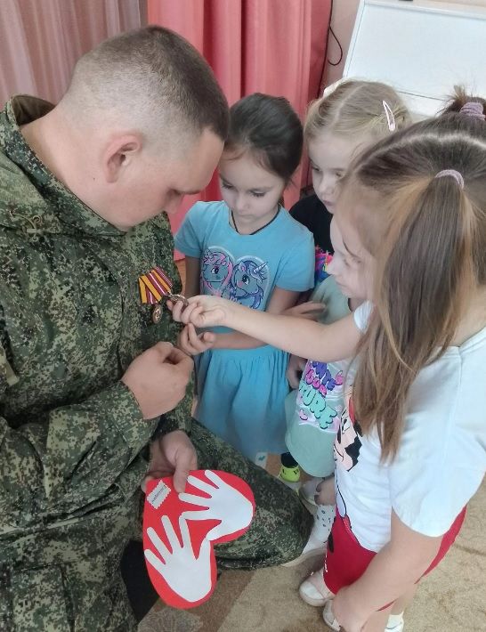 Военнослужащий Александр О. защищает Родину на специальной военной операции. Он приехал в краткосрочный отпуск. Но всё равно нашёл время прийти в детский сад и встретиться с дошкольниками. Ребята с нетерпением готовились, задавали вопросы про спецоперацию, про оружие, технику, которую используют бойцы в боевых действиях. Спрашивали, где они спят, готовят еду, какими качествами должен обладать современный солдат. Не передать, как светились глаза дошкольников, ведь рядом был настоящий военный: сильный, храбрый, надёжный. Гость рассказал дошкольникам о службе. Ребята узнали о солдатских буднях, отваге и боевом братстве. Александр был открытым и доброжелательным. В завершении встречи дети подарили гостю подарок-поделку в виде сердца, в знак уважения и памяти о нашей встрече.