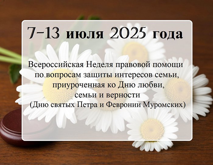 С 7 по 13 июля 2025 года в Саратовской области пройдет Всероссийская Неделя правовой помощи по вопросам защиты интересов семьи, приуроченная ко Дню любви, семьи и верности (Дню памяти святых Петра и Февронии Муромских). Мероприятие, организованное Управлением Министерства юстиции Российской Федерации по Саратовской области.