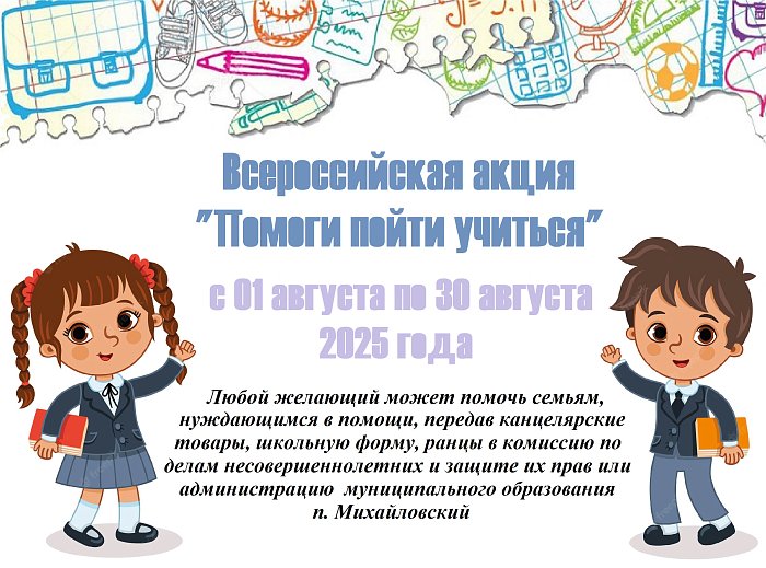 Каждый, кто готов помочь детям, может принять участие в акции и принести канцелярские товары, школьную форму, ранцыв комиссию по делам несовершеннолетних и защите их прав или администрацию муниципального образования п. Михайловский, по адресу: п. Михайловский, ул. 60 лет Победы, д. 6.